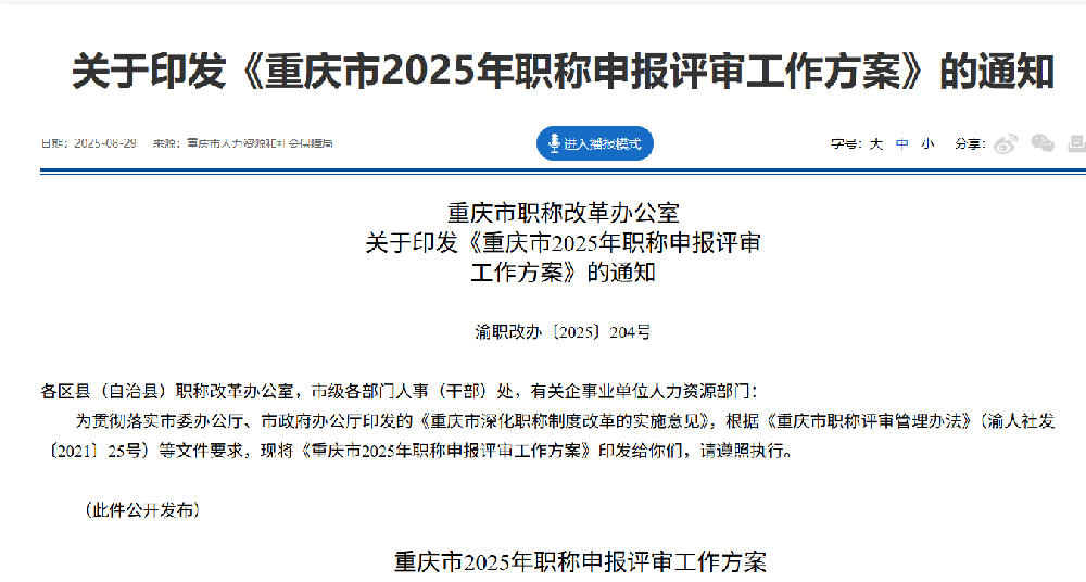 《重慶市2025年職稱申報(bào)評審工作方案》的通知?渝職改辦〔2025〕204號文件···